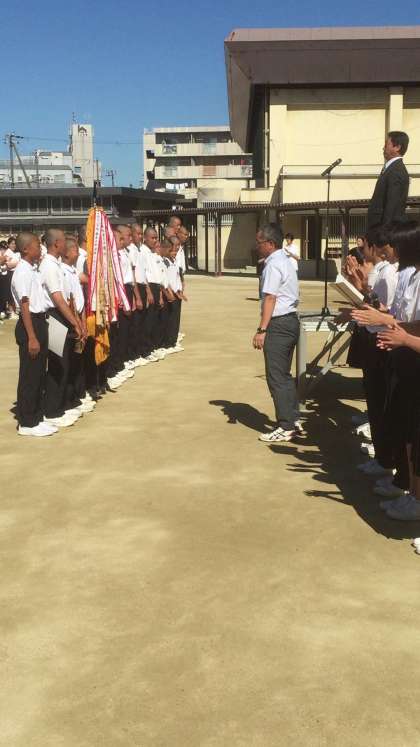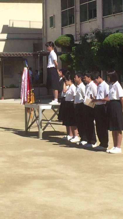 大阪市中体連春季総体で優勝した軟式野球部の表彰に続き、校長先生からのお話がありました。風紀委員会からは、今週の『あいさつ運動』について連絡がありました。