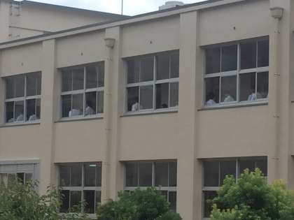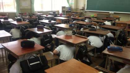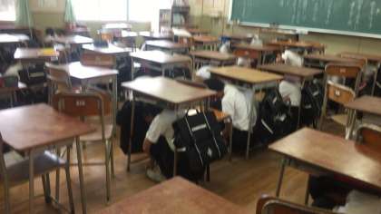 今回は強い地震のあと、大津波警報が発令されたのを想定し、一度机の下に潜り頭を保護したあと、全校生徒は担任の先生誘導のもと、迅速に3階、4階に避難しました。
