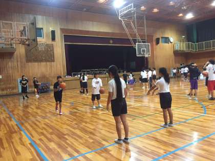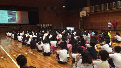 体験授業のあと体育館に集まって、生徒会役員からオリエンテーションがありました。