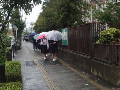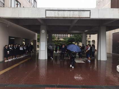 冷たい雨の中、今日も元気に『あいさつ運動』が行われています。