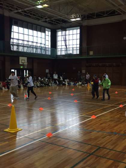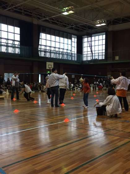 あいにくの雨で、体育館で行われていますが、みなさん元気に参加しています。
