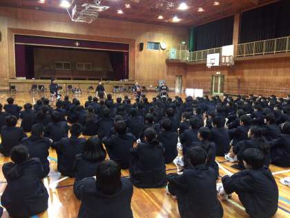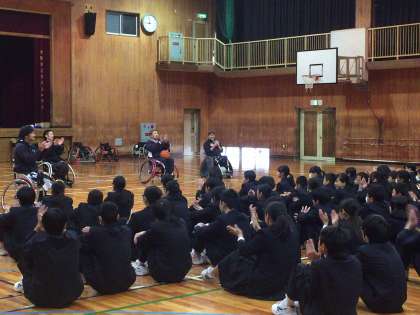 講師に車いすバスケットボールや車いすラグビーの選手を招き、競技の説明やデモンストレーションをしていただきました。