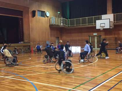 その後実際に車いすバスケットボールを、まず先生が、その後生徒たちが体験させていただきました。