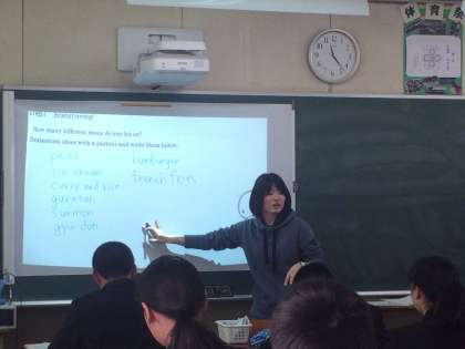 好きな食べ物を英語で尋ねて、ビンゴゲームをしています。