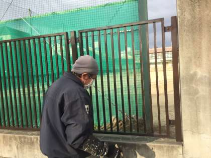 本日より加島小学校、三津屋小学校、十三小学校、東淀工業高等学校の管理作業員さんが美津島中学校に集まり、学校南側の鉄柵の塗り替え作業(合同作業)を実施していただいています。