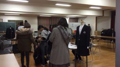 1月27日(土)9時30分〜12時00分まで、本校中・大会議室で、新入生の標準服・体操服の採寸を行っております。