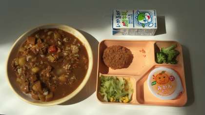 ポークカレーライス・ブロッコリー・ミンチカツ・キャベツときゅうりのサラダ・みかんゼリー・米飯・牛乳をおいしくいただきました。