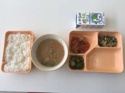 3月12日(月)、今日の給食の献立は、みそラーメン(炒めめん・スープ)・鶏肉のチリソースがけ・卵とニラの炒めもの・きゅうりのピリ辛漬け・米飯・牛乳です。