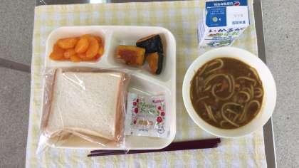 4月18日(水)、今日の給食の献立は、『カレースープスパゲッティ・焼きかぼちゃ・みかん(缶)・パン・パン添加物(アップルジャム)・牛乳』でした。