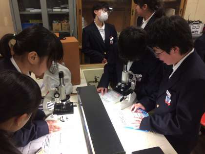 理科室で、ミジンコ、アルテミアのプレパラートを作成し、それぞれを顕微鏡で観察しています。