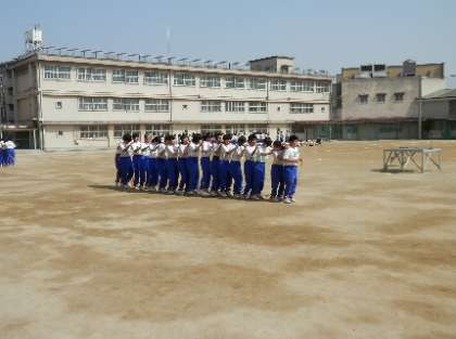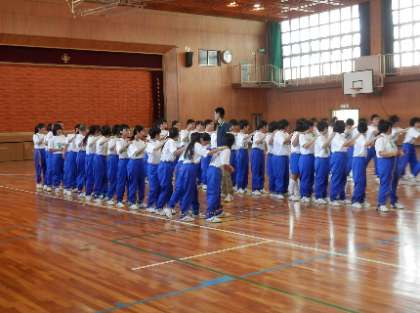 全員で体育館に集合し、体操をした後、学級ごとに体育館とグランドに分かれて練習しました。