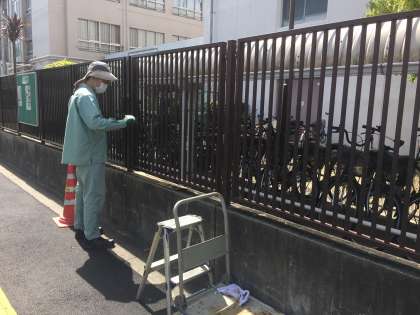 本日朝から管理作業員さんが、正門周辺の柵のペンキを塗ってくれました。