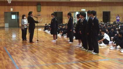 まず、前期生徒会役員・学級役員の認証式、女子バレーボール部の表彰を行いました。