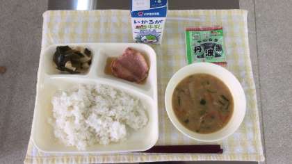5月9日(水)、今日の給食の献立は、『赤魚のしょうゆだれかけ・みそ汁・わかたけ煮・ソフト黒豆・米飯・牛乳』でした。明日は、パン給食の予定です。