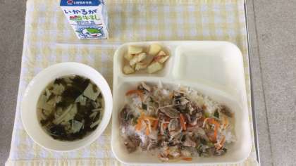 5月17日(木)、今日の給食の献立は、豚丼・ゆばのすまし汁・焼きじゃが・米飯・牛乳』です。明日は、パン給食の予定です。