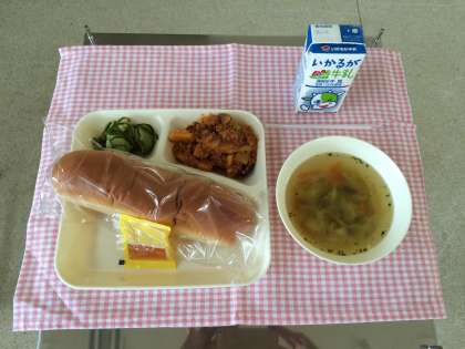 5月21日(月)、今日の給食の献立は、『じゃがいものミートグラタン・スープ・きゅうりのピクルス・パン・パン添加物・牛乳』でした。明日は、牛肉と大豆のカレーライス等、米飯給食の予定です。