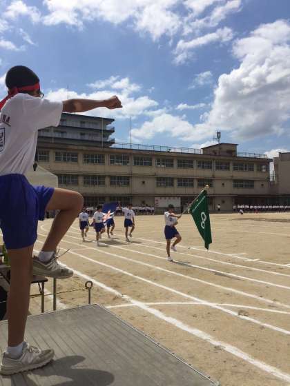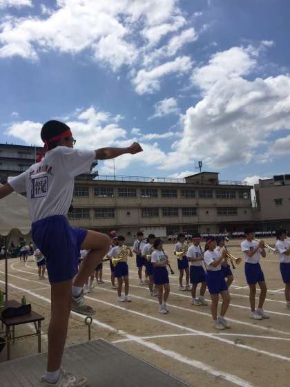 晴天のもと吹奏楽部、校旗、生徒会旗を先頭に入場行進が行われました。