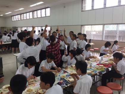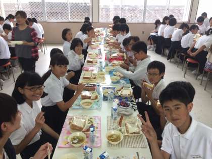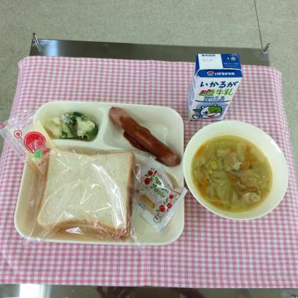 6月6日(水)、今日の給食の献立は、『ウインナーのケチャップソース・野菜スープ・じゃがいもと三度豆のサラダ・パン・パン添加物(アップルジャム)・牛乳』でした。