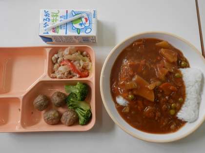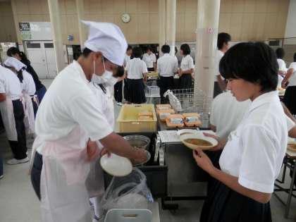 本日の給食はカレーでしたが、今までのレトルトカレーから食缶によるカレーの配膳に形式が変わりました。各学級の保健委員が、エプロンや三角巾をつけ、学級の仲間に配膳しました。カレーは、温かく具材も多めでなかなか好評でした。