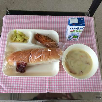 6月11日(月)、今日の給食の献立は、『サーモンフライ・豆乳コーンスープ・キャベツのカレーソテー・パン・パン添加物(いちごのジャム)・牛乳』です。