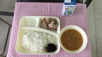 6月13日(水)、今日の給食の献立は、『豚肉のゆずの香焼き・みそ汁・のりのつくだ煮・米飯・牛乳』でした。明日は、パン給食の予定です。