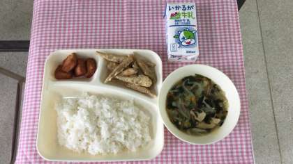 6月15日(金)、今日の給食の献立は、『いわしてんぷら・五目汁・あつあげのしょうがじょうゆかけ・米飯・牛乳』です。来週月曜日、6月18日は、米飯給食の予定です。