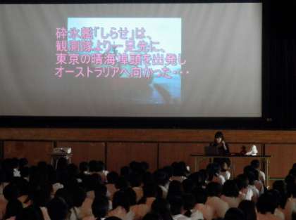 本日は、全校生徒を体育館に集め、第53次南極地域観測隊と同行され、昭和基地で約3ヶ月に渡って活動された東野智瑞子先生(現、関西第一高等学校、中学校の理科教諭)を講師としてお迎えし、南極授業を受けることができました。
