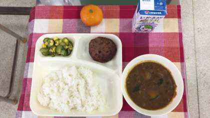 7月6日(金)、今日の給食の献立は、『夏野菜のカレーライス・焼きハンバーグ・きゅうりとコーンのサラダ・みかん(冷)・米飯・牛乳』でした。来週月曜日、9日も米飯給食の予定です。