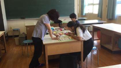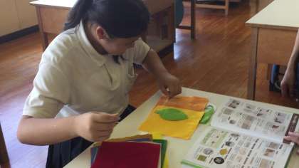 学校元気アップ事業のボランティアさんが教えてくださり、フェルトを使って、葉っぱ型のコースターを作りました。