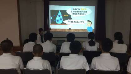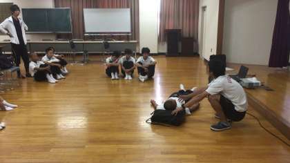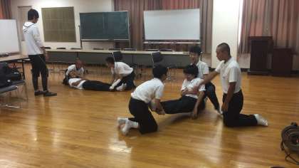 8月9日(木)13時より本校大会議室で生徒防災リーダー対象の『熱中症予防対策講習』を行いました。担当教員より生徒防災リーダーへ熱中症の予防対策と応急手当について説明し、実技の練習をしました。