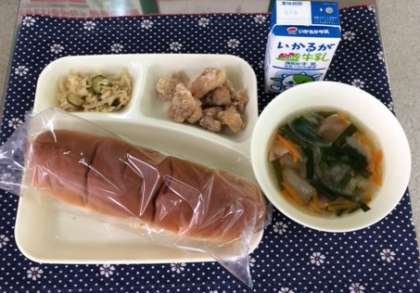 9月13日(木)、今日の給食の献立は、『鶏肉のからあげ・とうがんの中華スープ・切干だいこんの辛みづけ・パン・牛乳』でした。明日は、『豚肉の甘辛焼き・みそ汁・オクラのおかかいため・米飯・牛乳』の予定です。