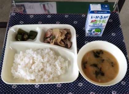 9月14日(金)、今日の給食の献立は、『豚肉の甘辛焼き・みそ汁・オクラのおかかいため・米飯・牛乳』でした。