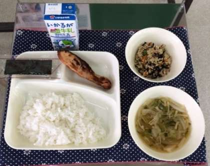 9月18日(火)、今日の給食の献立は『さけのしょうゆ風味焼き・五目汁・高野どうふのいり煮・米飯・牛乳』です。明日は、『あげギョーザ・中華煮(うずら卵)・和なし・パン・牛乳』の予定です。