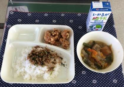 10月1日(月)、今日の給食の献立は、『鶏肉のたつたあげ・あつあげと野菜の煮もの・おかかなっ葉・米飯・牛乳』でした。