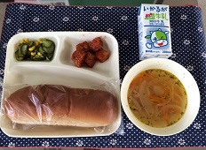 10月12日(金)、今日の給食の献立は、『まぐろのオーロラ煮・スープ・きゅうりとコーンのゆずドレッシング・パン・牛乳』でした。