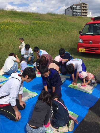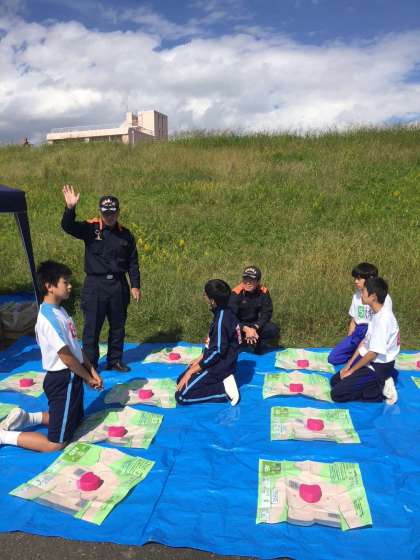 消防署の方の講習を受けて、心臓マッサージの仕方を参加された方に伝えています。