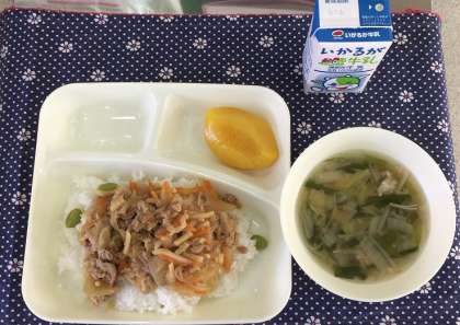 10月15日(月)、今日の給食の献立は、『ピリ辛丼・中華スープ・黄桃(缶)・米飯・牛乳』です。
