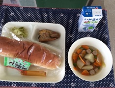 10月16日(火)、今日の給食の献立は、『鶏肉の香草焼き・スープ煮・サワーキャベツ・ソフト黒豆・パン・牛乳』でした。