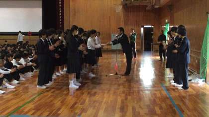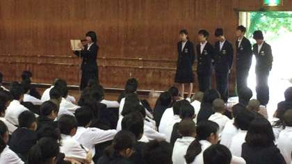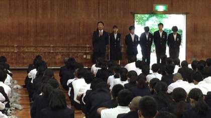 大阪市立中学校総合文化祭美術の部の賞状伝達に続き、校長先生からお話があり、その後、生徒会から週連絡、生徒指導主事からお祭りの楽しみ方を含めた帰宅後の諸注意がありました。
