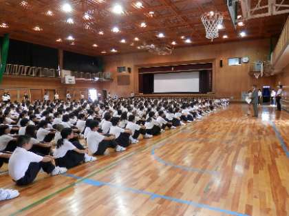 終業式では、校長からの話と生徒指導主事から夏休み中についての注意事項などについて話をしました。式の後には、熱中症対策に関する指導ビデオを鑑賞し、保健養護教諭より予防方法等に関する話がありました。暑い夏をしっかり乗り越えましょう。