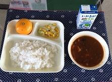 10月30日(火)、今日の給食の献立は、『ハヤシライス・キャベツとコーンのサラダ・みかん・米飯・牛乳』です。