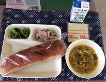 11月1日(木)、今日の給食の献立は、『豚肉のガーリック焼き・マカロニと野菜のスープ・カリフラワーのサラダ・スライスチーズ・パン・牛乳』でした。