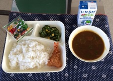 11月5日(月)、今日の給食の献立は、『えびカレーライス・きゅうりとコーンのサラダ・豆こんぶ・米飯・牛乳』でした。