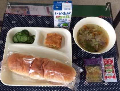 11月12日(月)、今日の給食の献立は、『ツナポテトオムレツ(トマトケチャップ)・スープ・きゅうりのバジル風味サラダ・パン(マーマレードジャム・ブルーベリージャム)・牛乳』です。