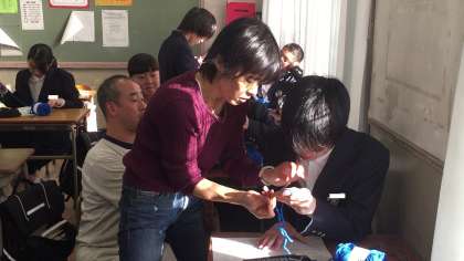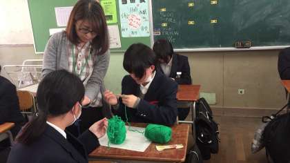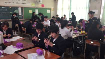学校元気アップ事業の学習支援ボランティアさんに教えていただき、各自、毛糸で帽子を編んでいます。