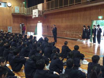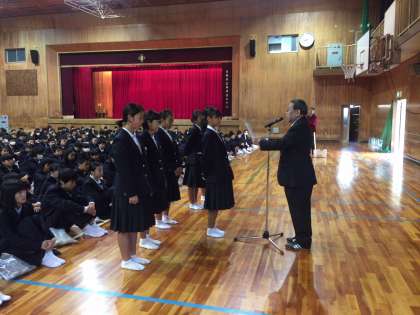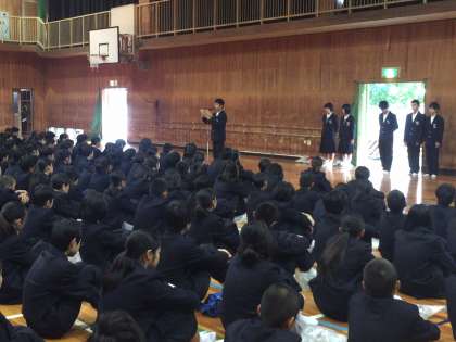 まず先日行われた、ソフトテニス部 4ブロック大会優勝の表彰の後、教頭先生からお話があり、その後、生徒会から今週の連絡がありました。