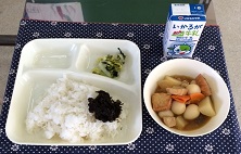 11月21日(水)、今日の給食の献立は、『関東煮・こまつなとはくさいの甘酢あえ・のりのつくだ煮・米飯・牛乳』でした。