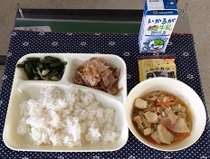 11月26日(月)、今日の給食の献立は、『豚肉のしょうがじょうゆかけ・けんちん汁・三度豆のからしじょうゆあえ・いり黒豆・米飯・牛乳』です。