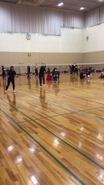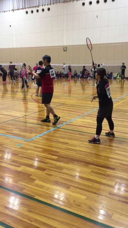 『淀川区PTAバドミントン大会』は、各コートで熱戦が続いています。美津島中学校チームは第1試合で田川小学校チームと対戦しています。
