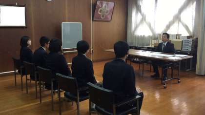 5〜6人を1組としたグループ面接を、緊張した雰囲気の中で行い、校長先生からの質問に対し、一人一人が真剣に答えていました。